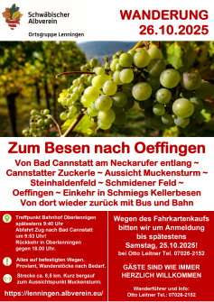 Dort geht es kurz bergauf zum Aussichtspunkt Muckensturm. Über Steinhaldenfeld und das Schmiedener Feld erreichen wir Oeffingen, wo wir im Schmiegs Kellerbesen einkehren. Zu dieser schönen Wanderung laden wir ein und freuen uns über viele Mitwanderer. Auch Gäste sind herzlich willkommen. Die Strecke beträgt ca. 8,5 km, alles auf befestigten Wegen. Die Rückfahrt erfolgt wieder mit Bus und Bahn nach Oberlenningen. Ankunft gegen 18:00 Uhr. Wegen des Fahrkartenkaufs bitten wir um Anmeldung bis spätestens Samstag 25.10.2025 bei Otto Leitner, Tel. 07026-2152
