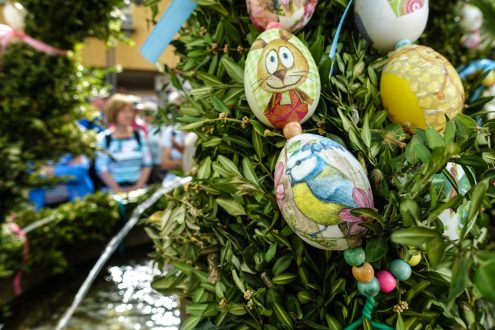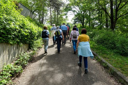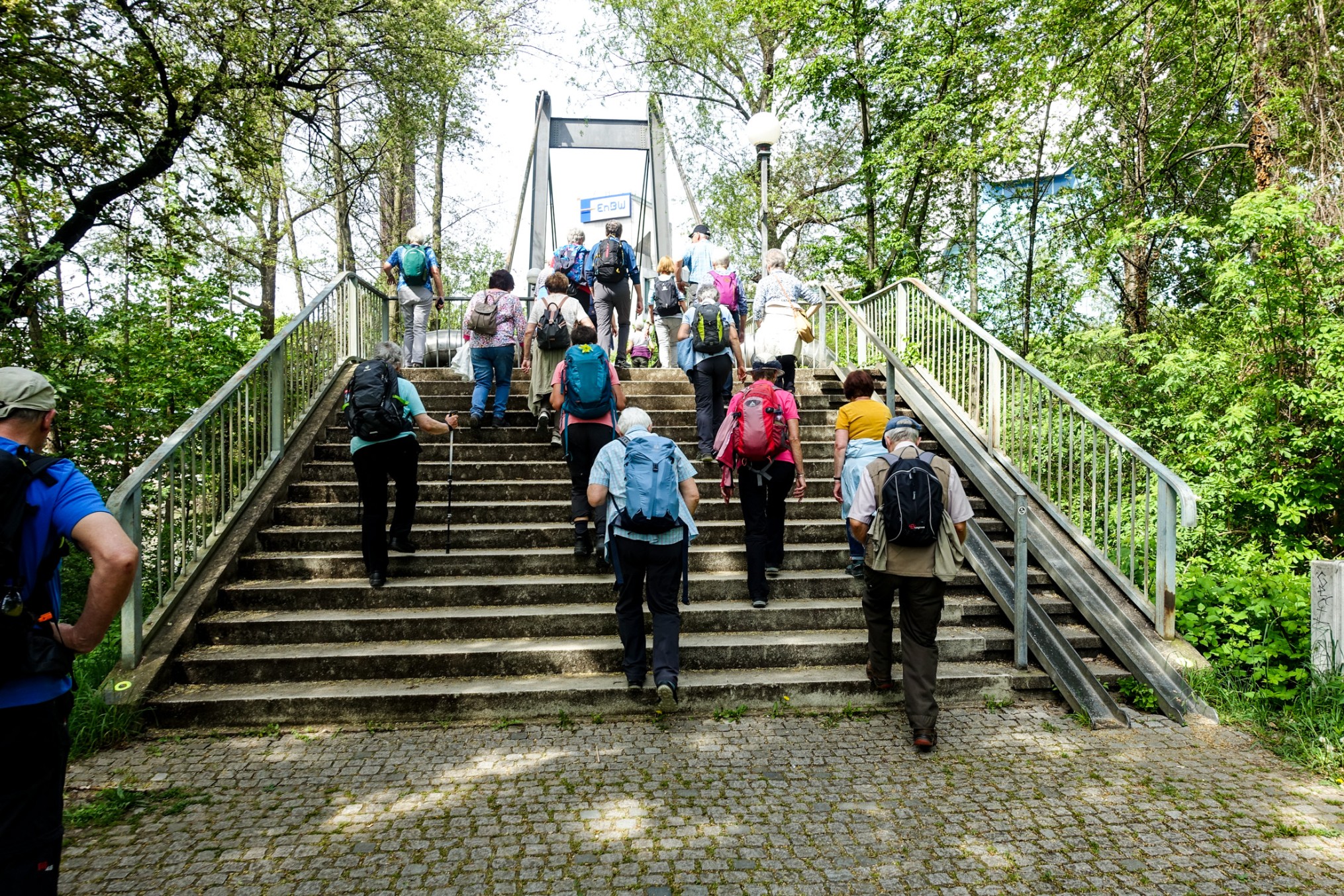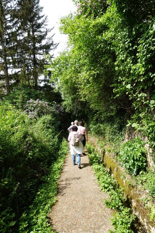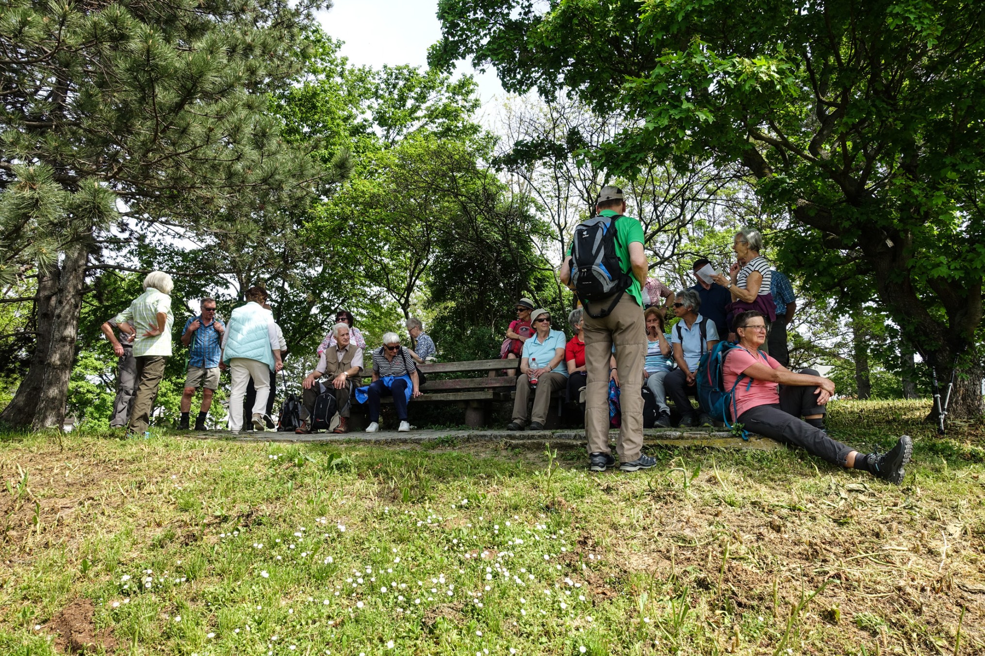 Von hier wandern wir durch den Wald, vorbei an blühenden Gärten und genießen die wunderschöne Aussicht über die Stadt und weit ins Land hinein.
