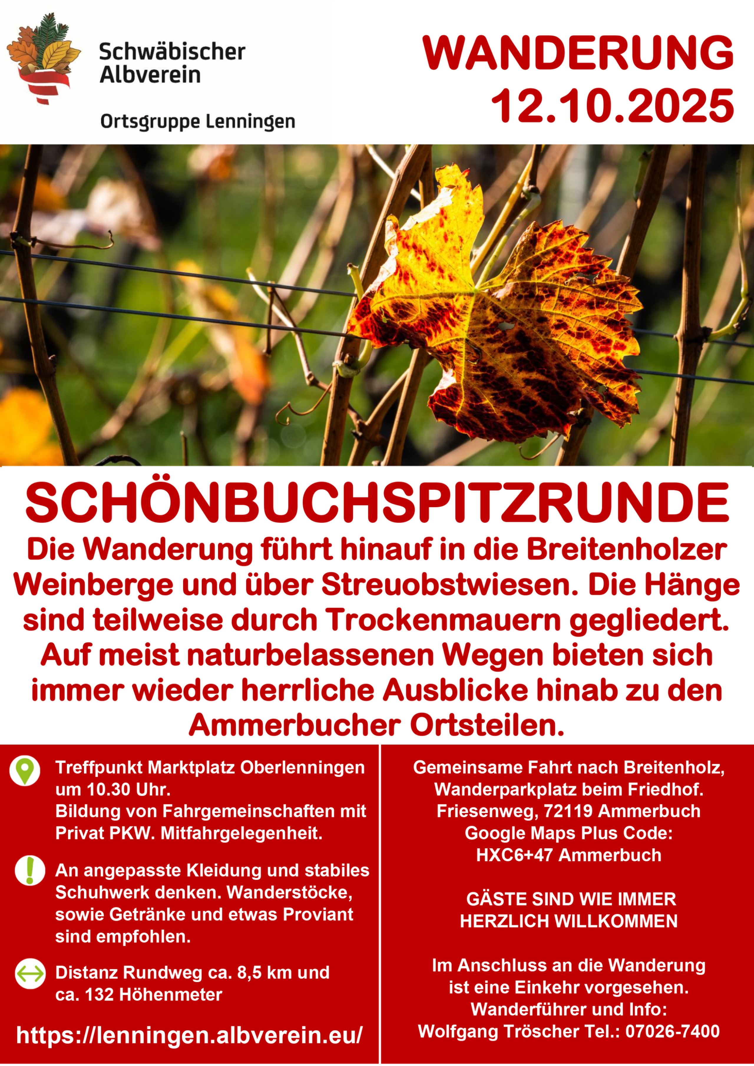 Wanderführer und Auskünfte: Wolfgang Tröscher Tel.: 07026-7400